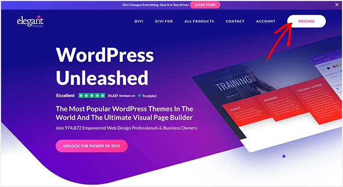First, you’ll need to click on our ElegantThemes.com discount link. Then, click on the ‘Pricing’ button in the top right corner to get started.