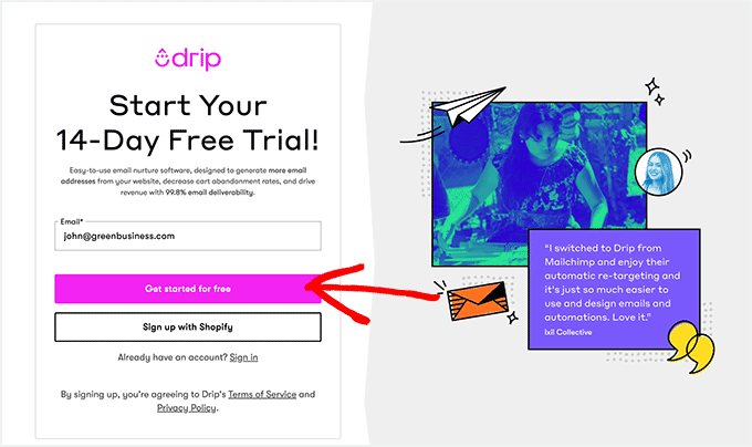 次のページで、新しいDripアカウントを作成するためにメールアドレスを入力するように求められます。サインアップすると、あなた自身とあなたのビジネスに関する詳細を追加できるようになります。