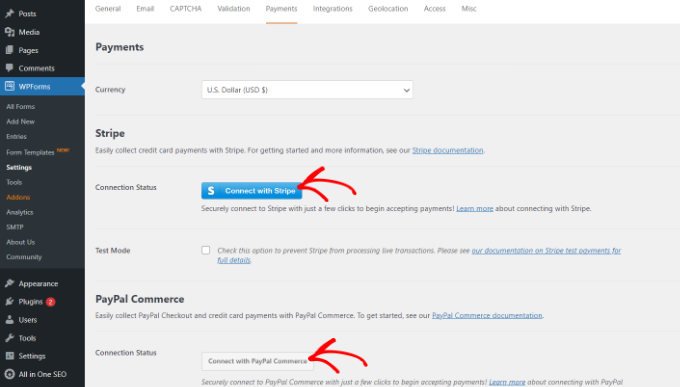 Als Nächstes können Sie in Ihrem WordPress-Dashboard zu WPForms » Einstellungen navigieren und auf die Registerkarte ‚Zahlungen‘ klicken. Von hier aus können Sie Ihre PayPal- und Stripe-Konten verbinden.