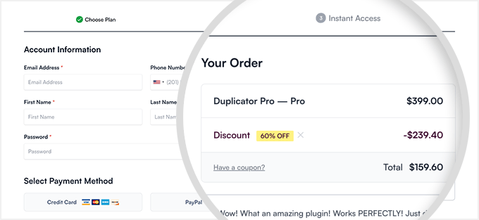 This will take you to the checkout page, where you can view the order summary and the Duplicator discount details.