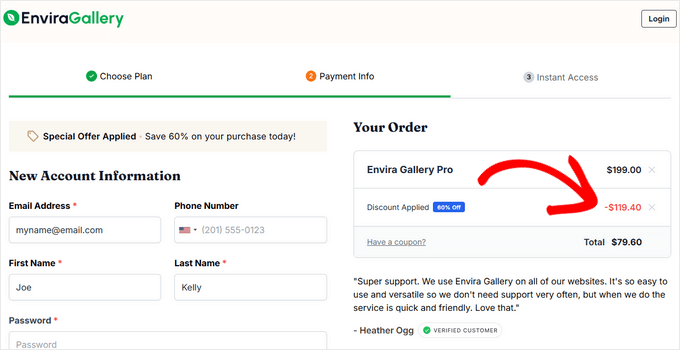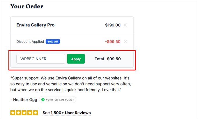 Ora, noterai che il riepilogo dell'ordine verrà aggiornato con il nuovo sconto e prezzo di Envira Gallery.