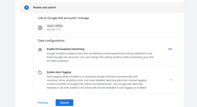 Nel passaggio successivo, Google Analytics ti offrirà opzioni per abilitare la pubblicità personalizzata e il tagging automatico.