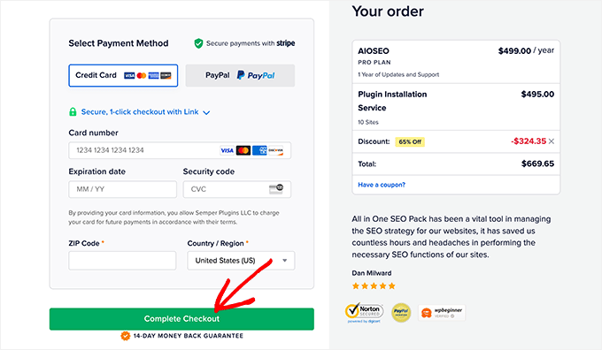 注文概要を確認すると、当社の限定 AIOSEO 割引の詳細と、AIOSEO Pro プランの合計金額が表示されます。