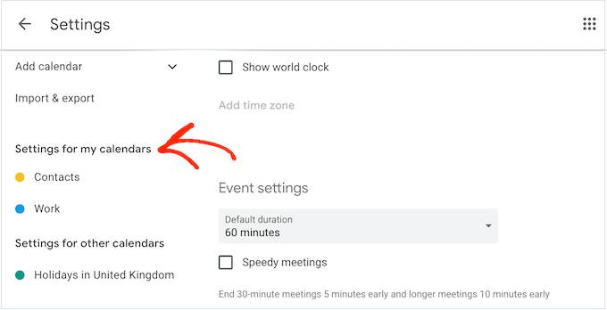This will take you to a new page where you have to find the ‘Settings for my calendars’ section on the left. Here, you’ll see a list of all the calendars you’ve created.