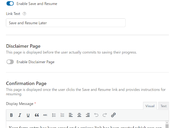 Besides that, there is an option to enable a disclaimer page, which is shown to users before they save their progress. WPForms also lets you edit the confirmation page settings and change the text displayed on the page.