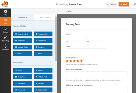 Creating a form with WPForms is easy using its simple drag-and-drop interface. You can drag form fields from the left to the form editor on the right side.